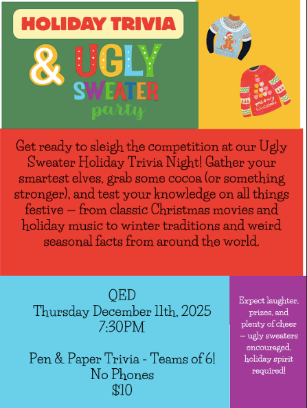 • Get ready to sleigh the competition at our Ugly Sweater Holiday Trivia Ngiht! Gather your smartest elves, grab some cocoa (or something stronger), and test your knowledge on all things festive -- from classic Christmas movies andholiday music to winter traditions and weird seasonal facts fro around the world.