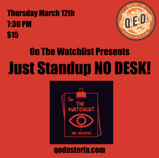 On The Watchlist with Jay Servedio is a brand-new live late-night comedy series that blends biting satire with investigative curiosity. Inspired by The Daily Show but rooted in its own chaotic, absurdist voice, On The Watchlist dives headfirst into the week’s headlines, media manipulation, and political theater. This is our stand-up spin-off of the show: no desk or PowerPoint, but still the same cutting edge take on the news!
