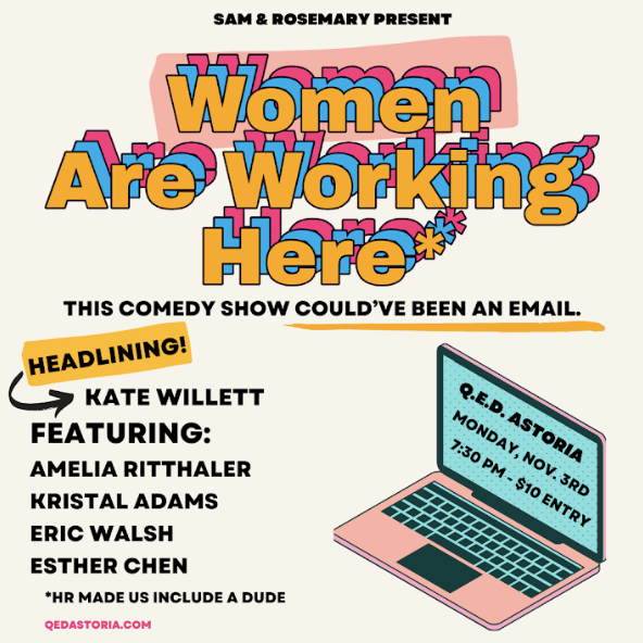 Join your favorite corporate underlings and comedians Sam Doctor and Rosemary Cipriano for an evening of raging against the workplace. Featuring the funniest women in your team meeting, and one man (for diversity purposes).